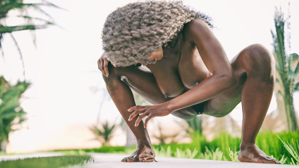 The guy is shocked when he sees the gigantic woman and realizes the jungle is not uninhabited at all.